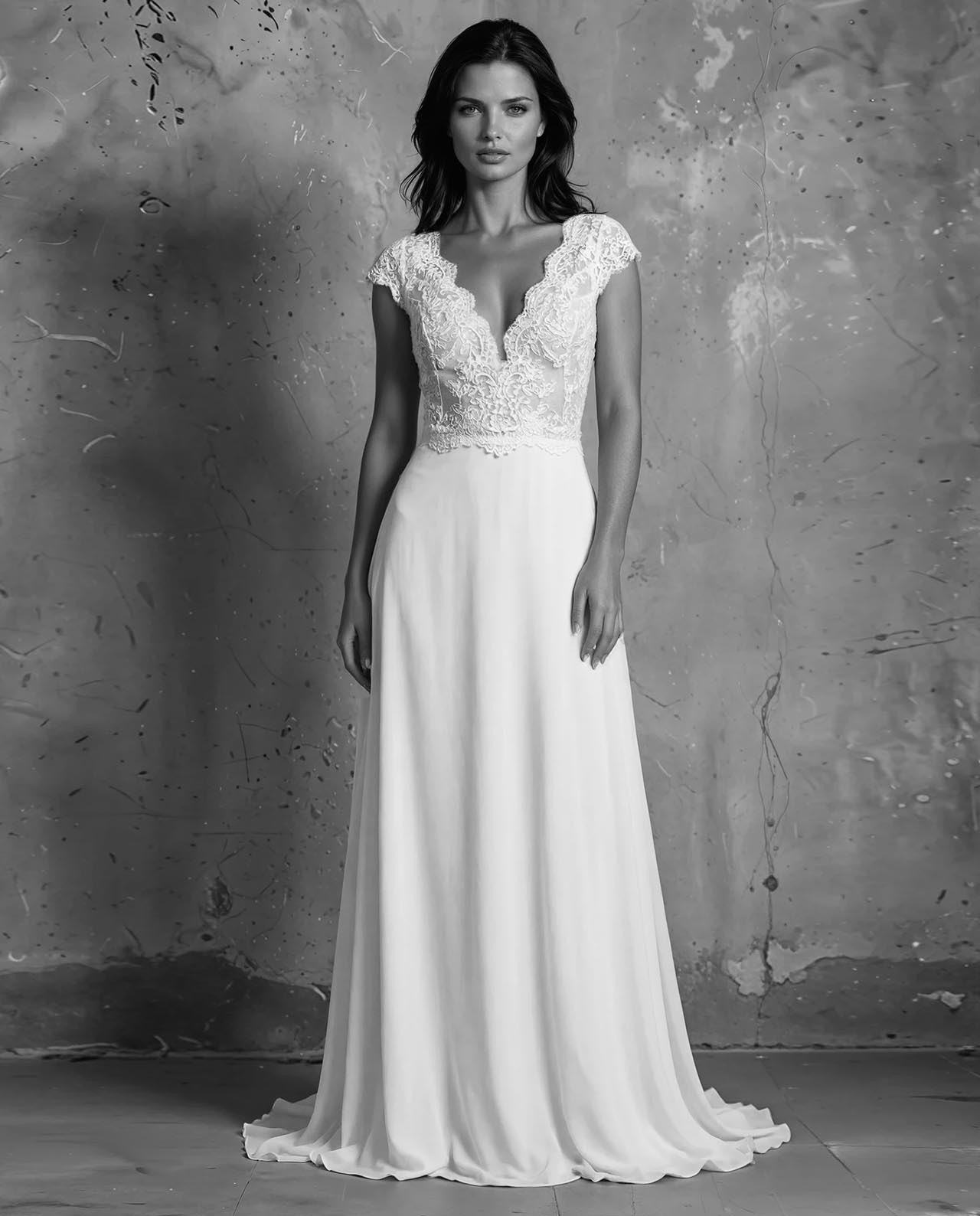 Style 4. Kollektionsprøve. Gudnitz Copenhagen. Brudekjole med blondetop og enkelt chiffonskørt med slæb.